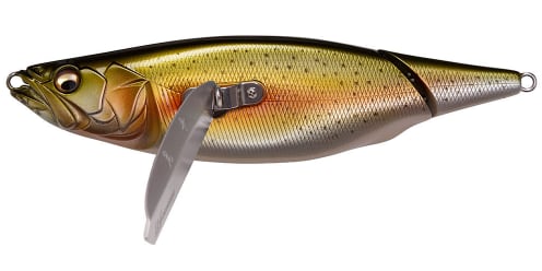 ■高速リトリーブでは、ボディは水面から剥離する「ホバリング状態」となり、ビッグボディを感じさせない軽やかなバジングを披露。 ウィングアクションと連動して作動する内臓されたR.A.B(Rudder Action Balancer System PAT.)は、ボディ内で舵切りアクションを発生させ、ジョインテッドテールをしなやかにテールウォークさせながらワンテンポ遅れたディレイサウンドを発生。遠く離れたターゲットを確実に刺激して訴求。