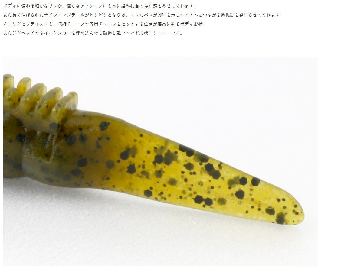 ボディに備わる細かなリブが水流に絡み、そしてロングナイフエッジテールがタイトになびき微振動を発生するキンクーシェイプは昇華継承され、ネコリグやワッキーリグだけではなく、テキサスリグやリーダーレスダウンショットなどによる素早いリフト&フォール、またジグヘッドリグやノーシンカーリグによるウィ―ド攻略やジグヘッドワッキーの中層攻略にも対応できる高い汎用性で、これからも多くの実績を叩き出してくれます。