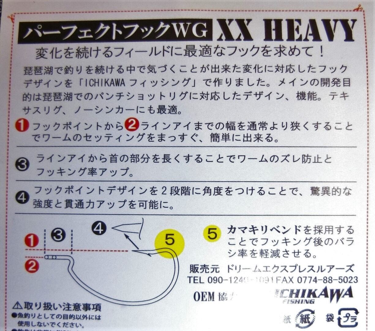パーフェクトフックWG>琵琶湖対応のストロングワイドゲーブフック、琵琶湖でよく使われているボリューミーなワームに差異的!カマキリベンドを搭載する事でワームに対して真っすぐに誰でも簡単にセッティング出来る事が感動。8インチ~5インチまでのソフトジャークベイト系、5インチ~3.5インチまでのフラット系ギルワームにも差異的。もちろんパンチショットリグ、ダイレクトショットリグやノーシンカー、テキサスにバッチリ使う事が出来ます。