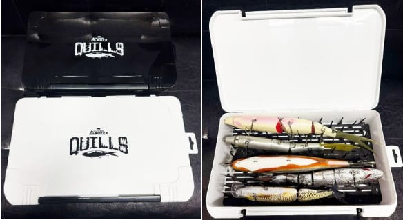 Gボックスの大きいサイズを作りました!その名も”Gボックスクイールズ“クイールズの意味はヤマアラシ 明邦の1番大きいBOXにトゲトゲを入れてゴーストもVテール付きで入れれるBIGなサイズ。蓋を閉じれば振り回しても中身は動かない。デカいルアーは大体これでOK。フックは上向きで入れるとからまずに取り出せます。